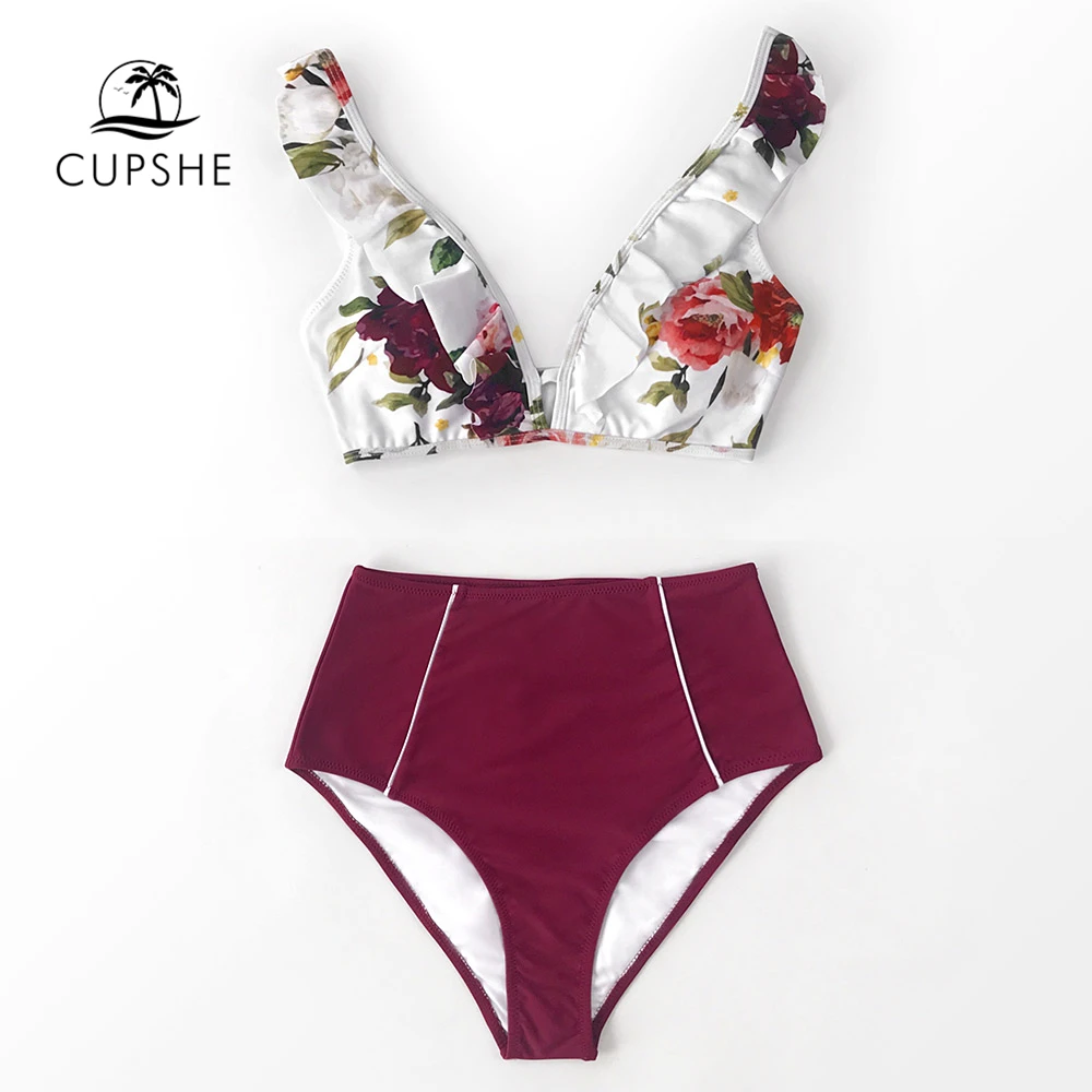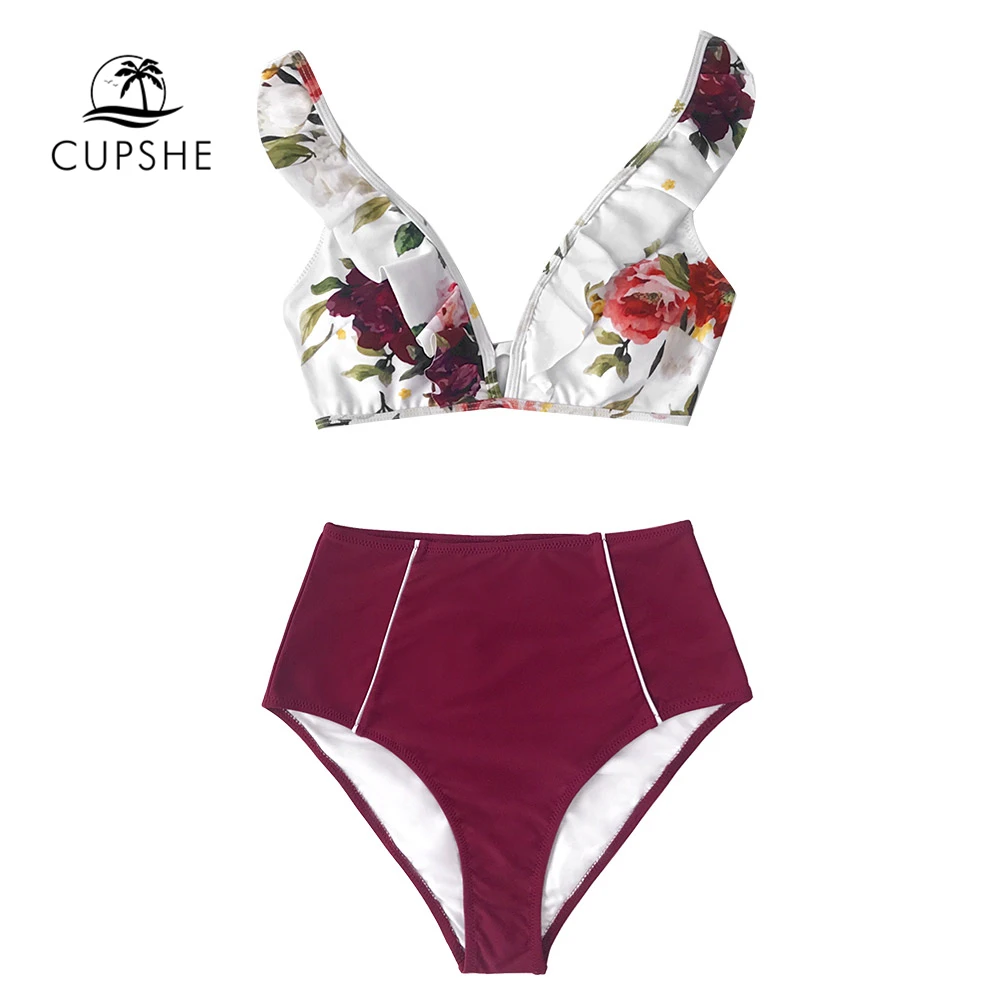Discount CUPSHE Floral and Red High-waisted Bikini Sets Sexy Ruffled Tank Top Swimsuit Two Pieces Swimwear W